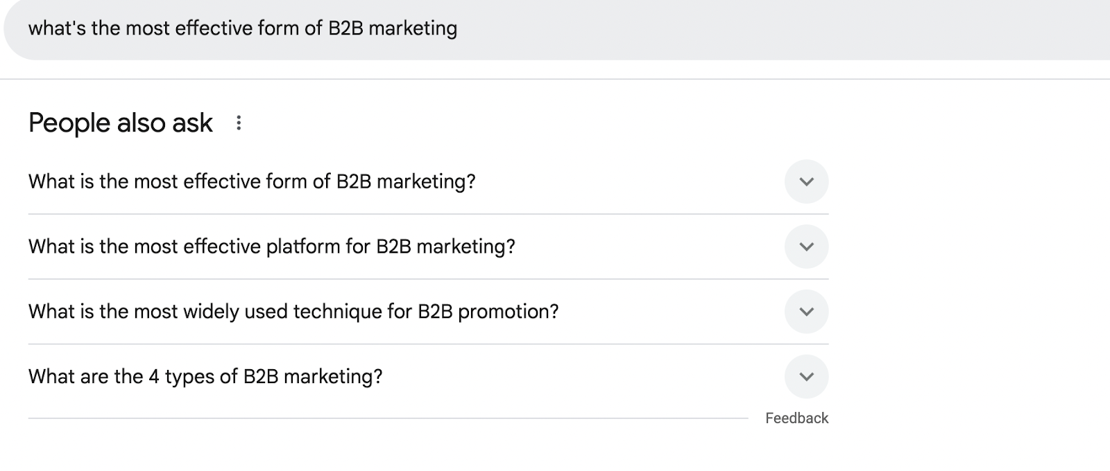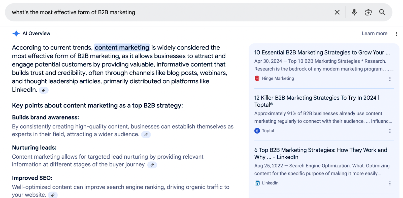 Simply put, zero-click marketing refers to search engines and platforms delivering information instantly via AI Overviews, featured snippets, and "People Also Ask" sections. For example, when a user searches for 'what’s the most effective form of B2B marketing,' they may see an AI overview summarizing key points from high-ranking blog posts without needing to click through to the website.